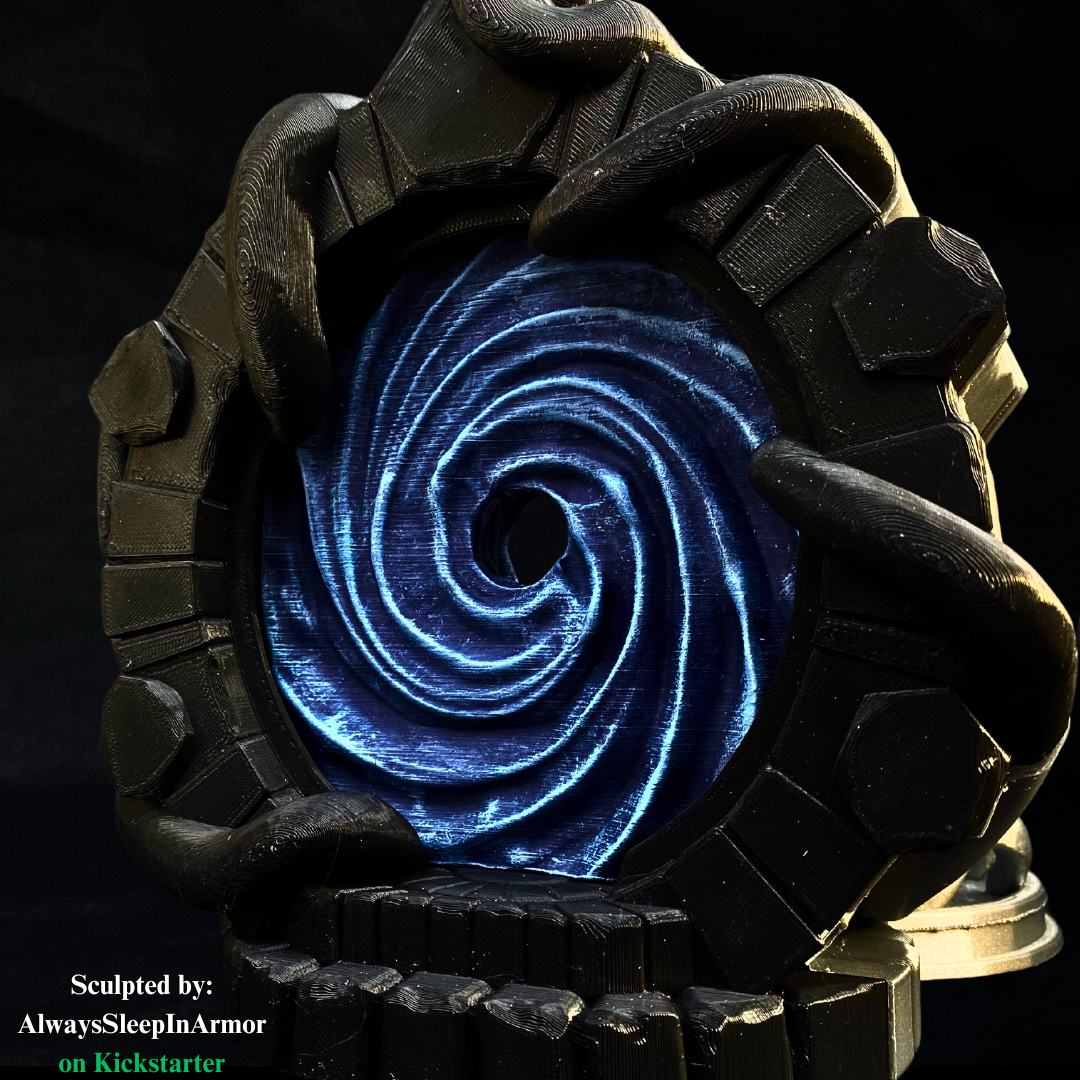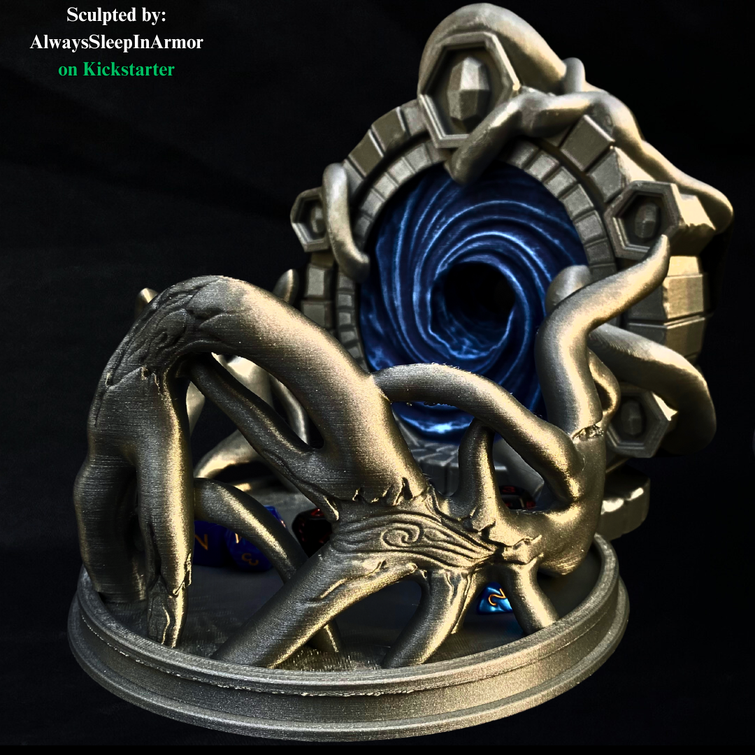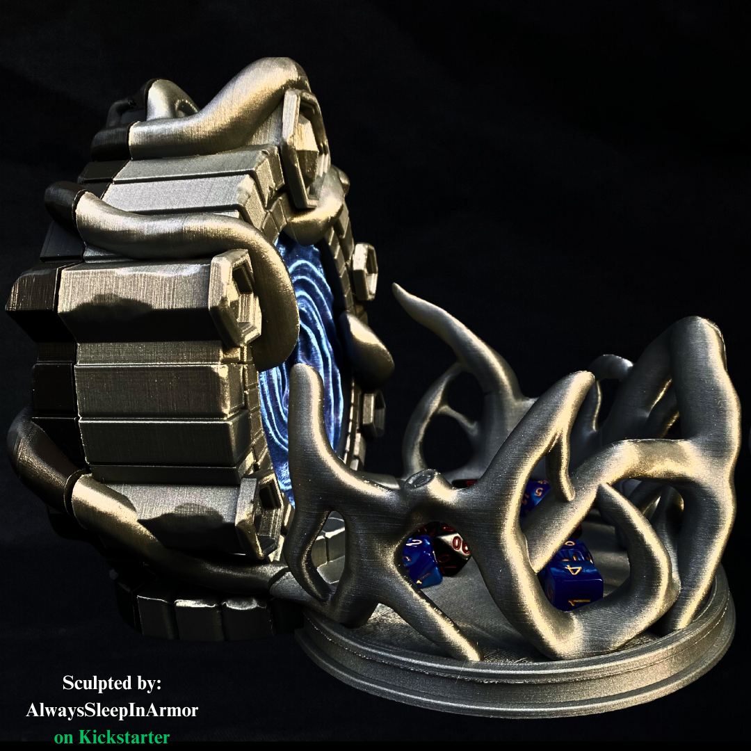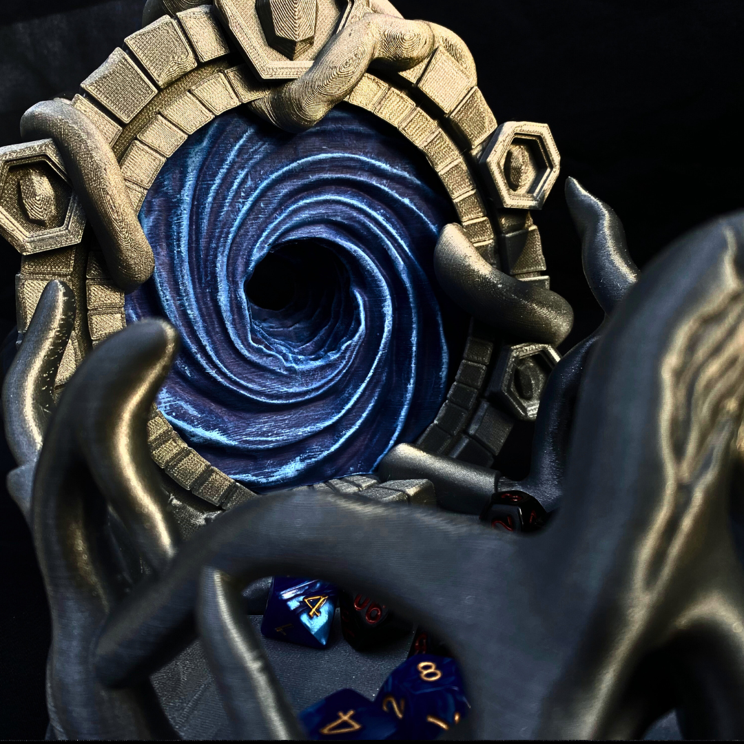 Forged in forgotten ages and sealed with runes best left untranslated, this unpainted PLA tower pulls your dice into a swirling gateway between worlds, powered by whatever magical nonsense your wizard insists “totally won’t explode.”